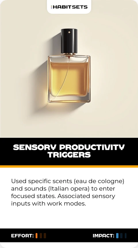 Used specific scents (eau de cologne) and sounds (Italian opera) to enter focused states. Associated sensory inputs with work modes.