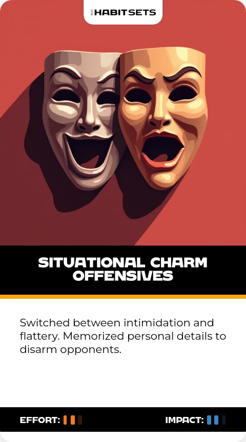 Switched between intimidation and flattery. Memorized personal details to disarm opponents.
