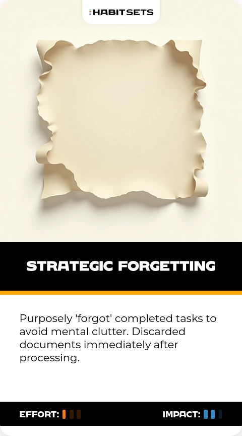 Purposely 'forgot' completed tasks to avoid mental clutter. Discarded documents immediately after processing.