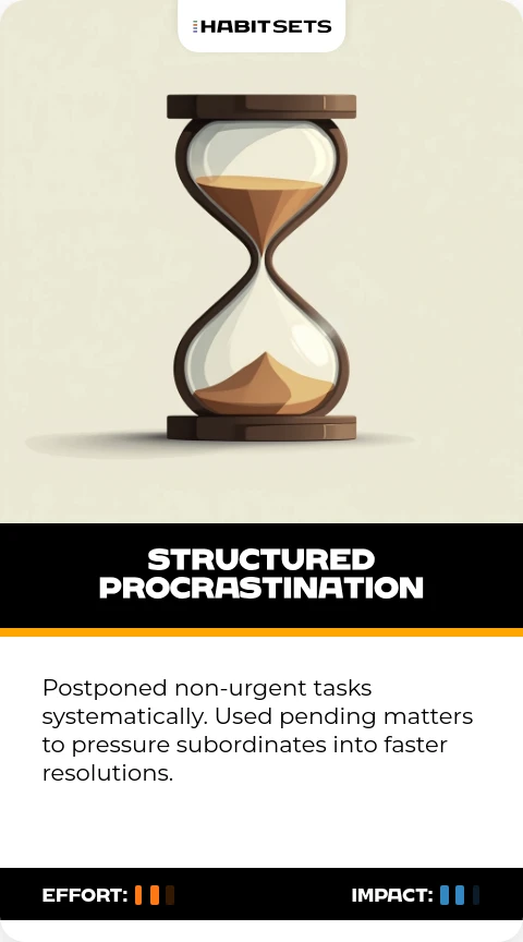 Postponed non-urgent tasks systematically. Used pending matters to pressure subordinates into faster resolutions.