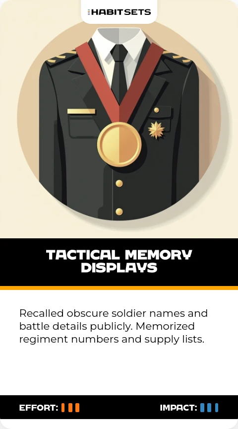 Recalled obscure soldier names and battle details publicly. Memorized regiment numbers and supply lists.