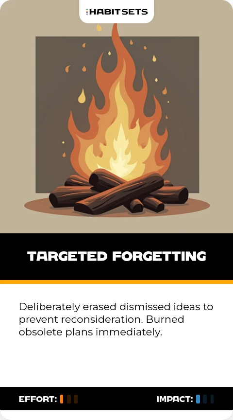 Deliberately erased dismissed ideas to prevent reconsideration. Burned obsolete plans immediately.