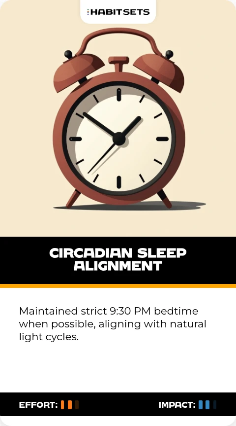 Maintained strict 9:30 PM bedtime when possible, aligning with natural light cycles.