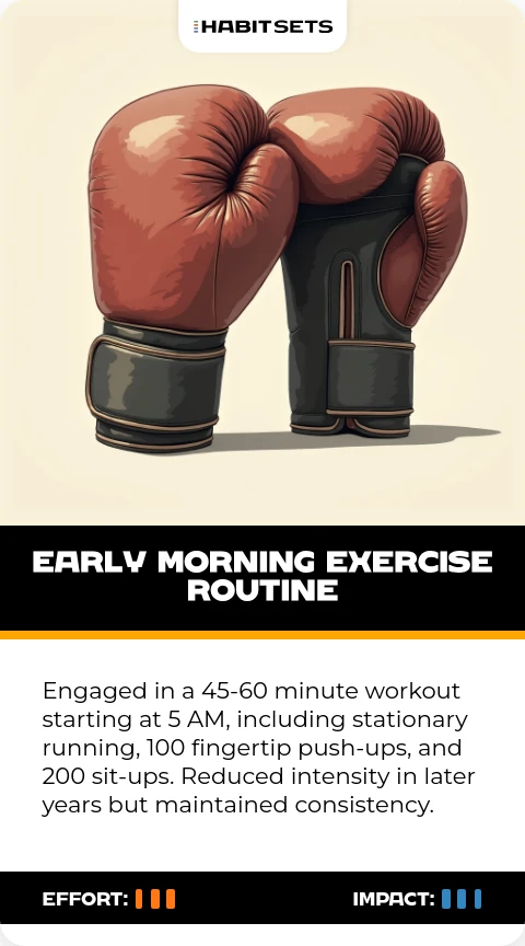 Engaged in a 45-60 minute workout starting at 5 AM, including stationary running, 100 fingertip push-ups, and 200 sit-ups. Reduced intensity in later years but maintained consistency.