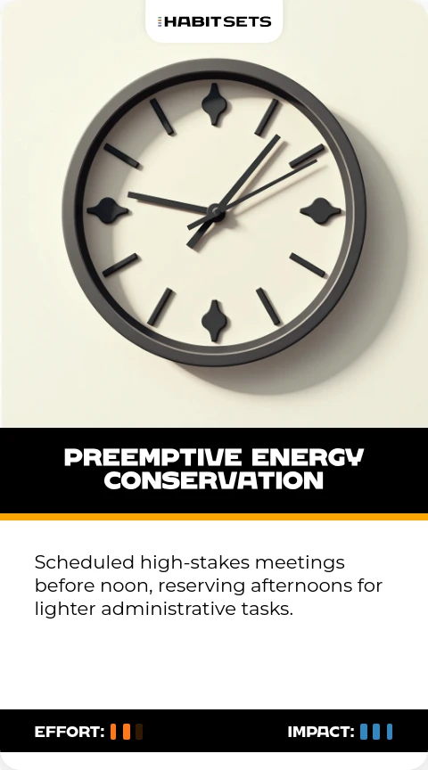 Scheduled high-stakes meetings before noon, reserving afternoons for lighter administrative tasks.