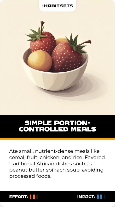 Ate small, nutrient-dense meals like cereal, fruit, chicken, and rice. Favored traditional African dishes such as peanut butter spinach soup, avoiding processed foods.
