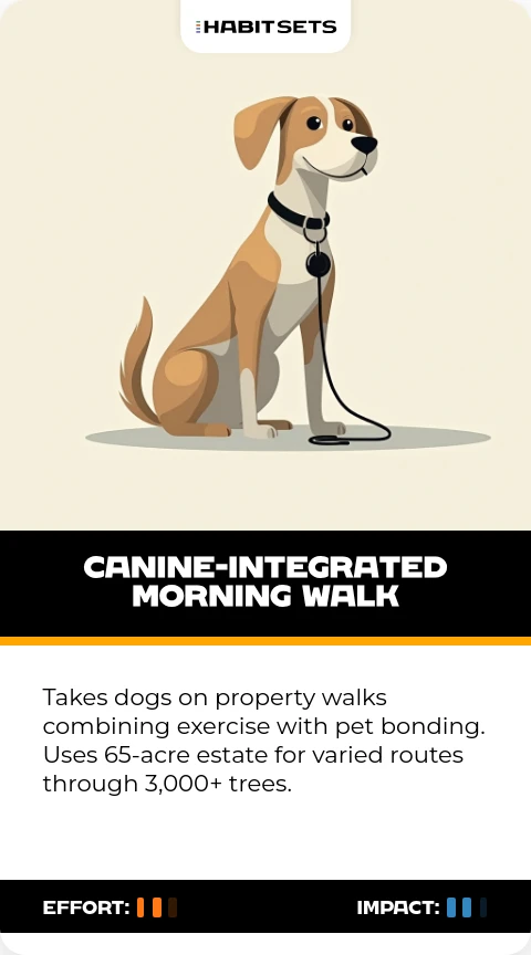 Takes dogs on property walks combining exercise with pet bonding. Uses 65-acre estate for varied routes through 3,000+ trees.