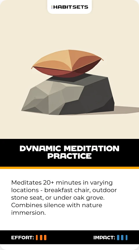 Meditates 20+ minutes in varying locations - breakfast chair, outdoor stone seat, or under oak grove. Combines silence with nature immersion.