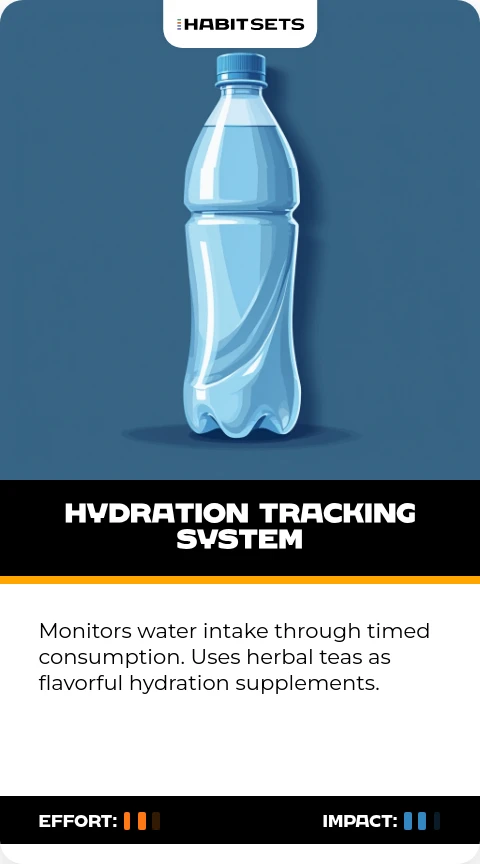 Monitors water intake through timed consumption. Uses herbal teas as flavorful hydration supplements.