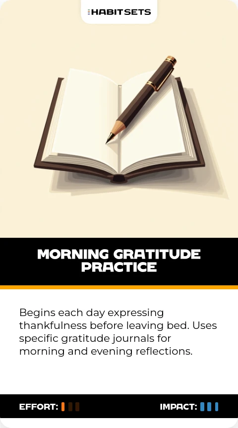 Begins each day expressing thankfulness before leaving bed. Uses specific gratitude journals for morning and evening reflections.