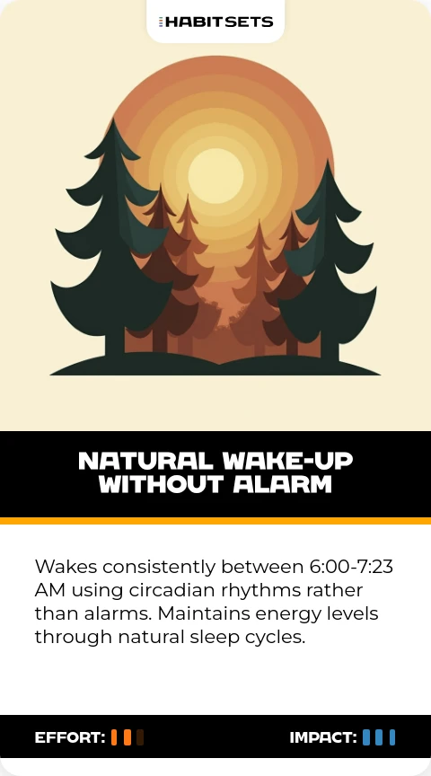 Wakes consistently between 6:00-7:23 AM using circadian rhythms rather than alarms. Maintains energy levels through natural sleep cycles.