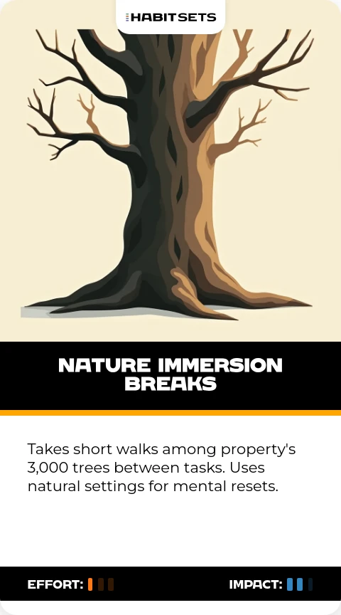 Takes short walks among property's 3,000 trees between tasks. Uses natural settings for mental resets.