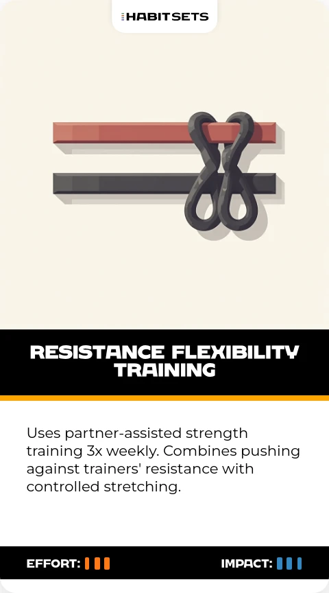 Uses partner-assisted strength training 3x weekly. Combines pushing against trainers' resistance with controlled stretching.