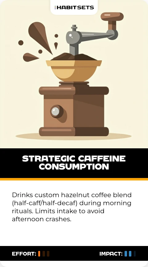 Drinks custom hazelnut coffee blend (half-caff/half-decaf) during morning rituals. Limits intake to avoid afternoon crashes.