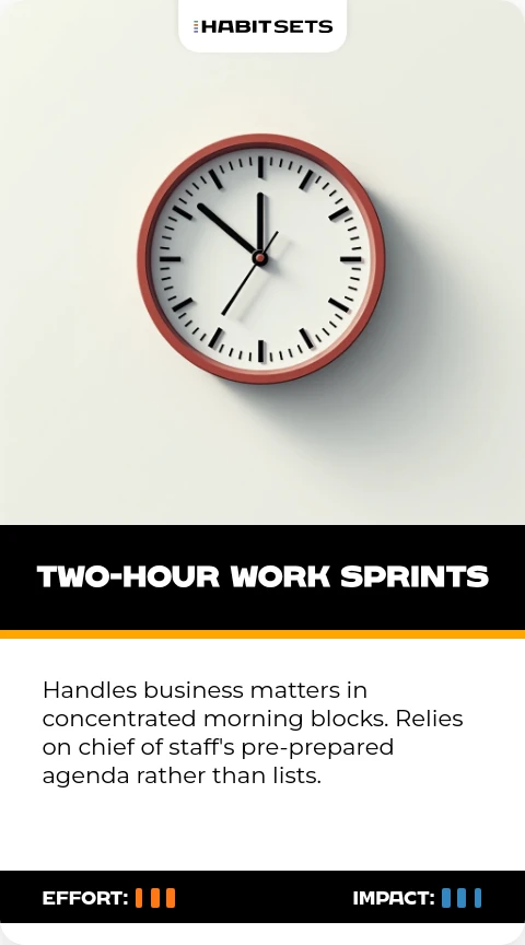 Handles business matters in concentrated morning blocks. Relies on chief of staff's pre-prepared agenda rather than lists.