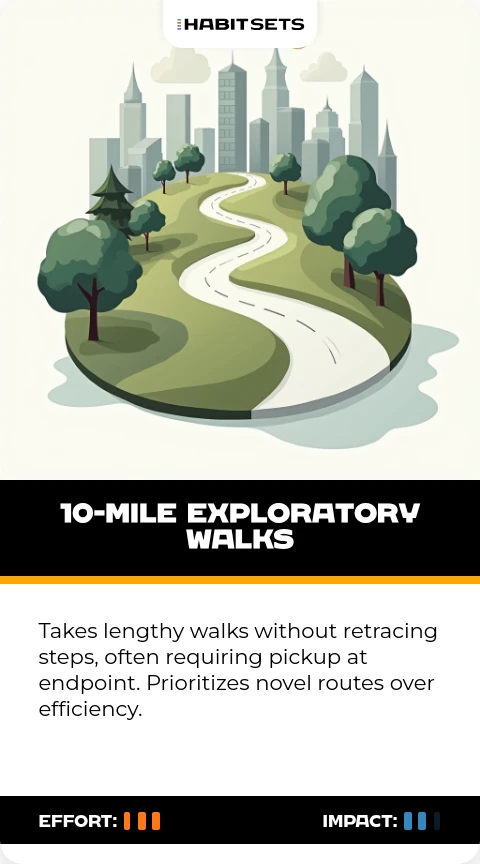Takes lengthy walks without retracing steps, often requiring pickup at endpoint. Prioritizes novel routes over efficiency.