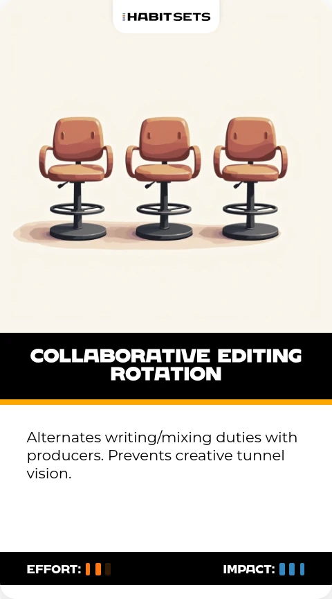 Alternates writing/mixing duties with producers. Prevents creative tunnel vision.