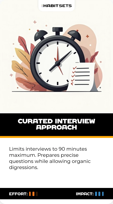 Limits interviews to 90 minutes maximum. Prepares precise questions while allowing organic digressions.