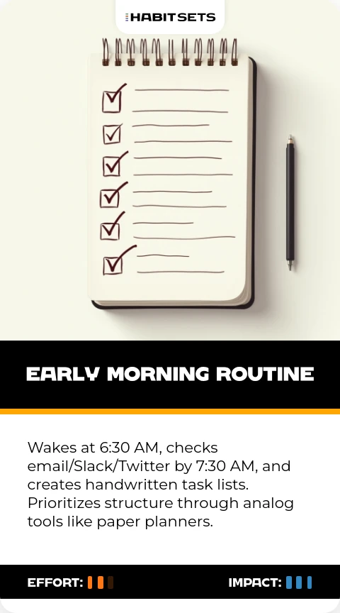 Wakes at 6:30 AM, checks email/Slack/Twitter by 7:30 AM, and creates handwritten task lists. Prioritizes structure through analog tools like paper planners.