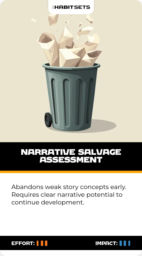 Abandons weak story concepts early. Requires clear narrative potential to continue development.