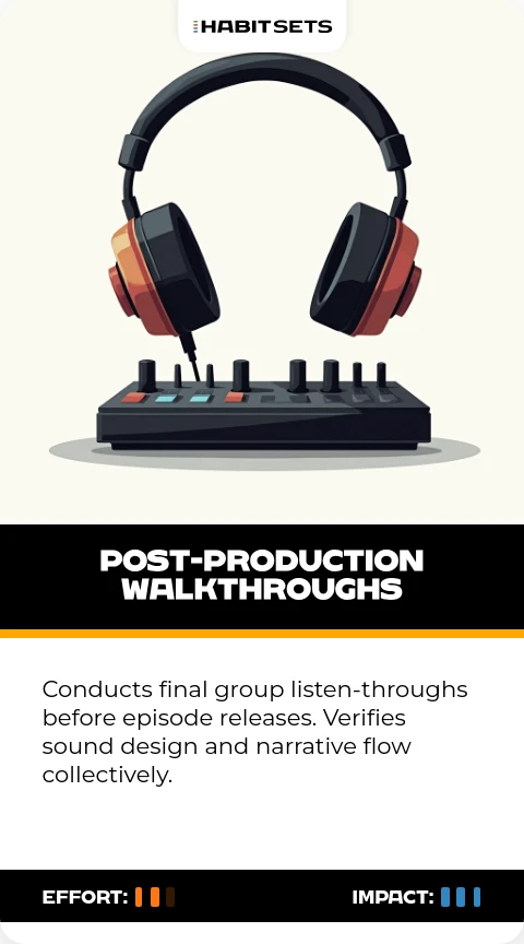 Conducts final group listen-throughs before episode releases. Verifies sound design and narrative flow collectively.