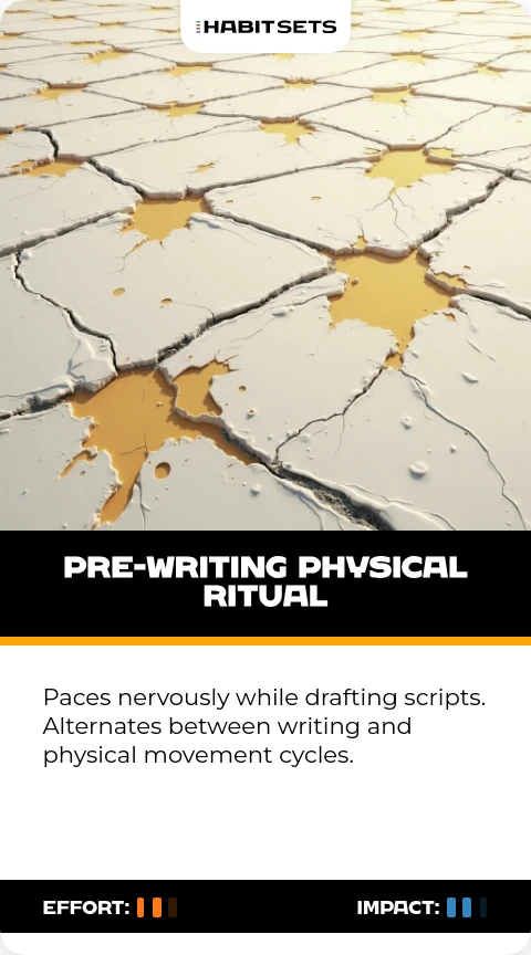 Paces nervously while drafting scripts. Alternates between writing and physical movement cycles.