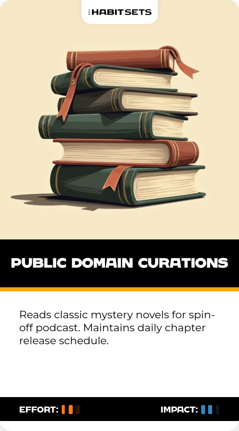 Reads classic mystery novels for spin-off podcast. Maintains daily chapter release schedule.