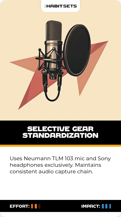 Uses Neumann TLM 103 mic and Sony headphones exclusively. Maintains consistent audio capture chain.
