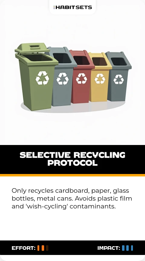 Only recycles cardboard, paper, glass bottles, metal cans. Avoids plastic film and 'wish-cycling' contaminants.