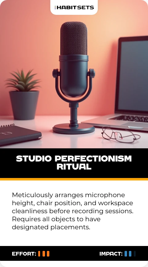 Meticulously arranges microphone height, chair position, and workspace cleanliness before recording sessions. Requires all objects to have designated placements.