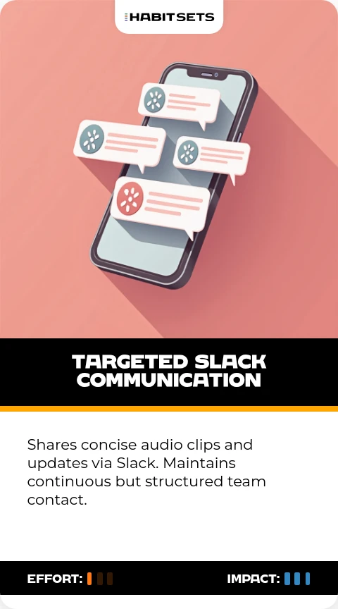 Shares concise audio clips and updates via Slack. Maintains continuous but structured team contact.
