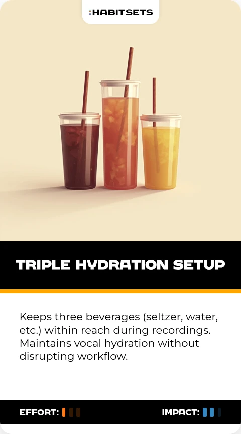 Supports Judge's vocal endurance during long recording sessions. The ritualized setup prevents dry mouth while preserving the podcast's signature smooth delivery.