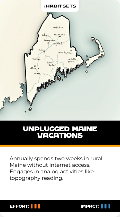 Annually spends two weeks in rural Maine without internet access. Engages in analog activities like topography reading.