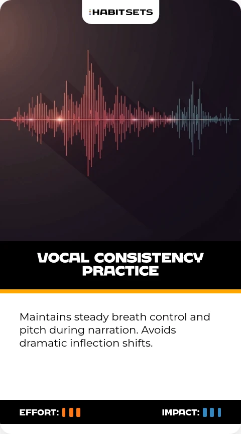 Maintains steady breath control and pitch during narration. Avoids dramatic inflection shifts.