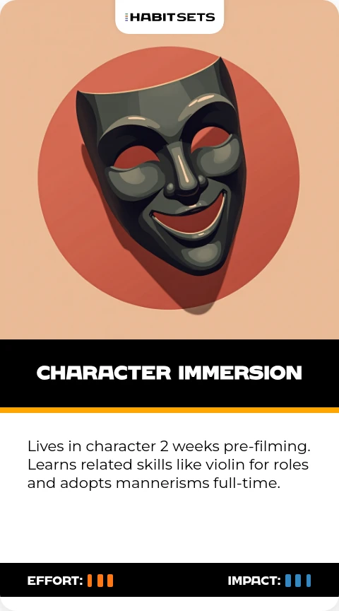 Lives in character 2 weeks pre-filming. Learns related skills like violin for roles and adopts mannerisms full-time.