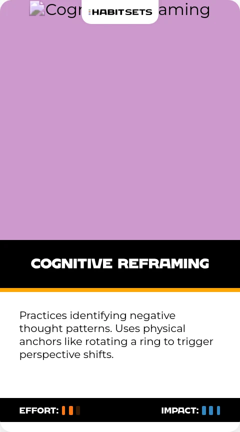 Practices identifying negative thought patterns. Uses physical anchors like rotating a ring to trigger perspective shifts.