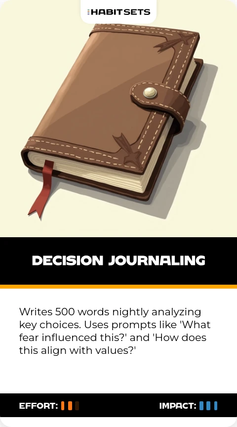 Writes 500 words nightly analyzing key choices. Uses prompts like 'What fear influenced this?' and 'How does this align with values?'