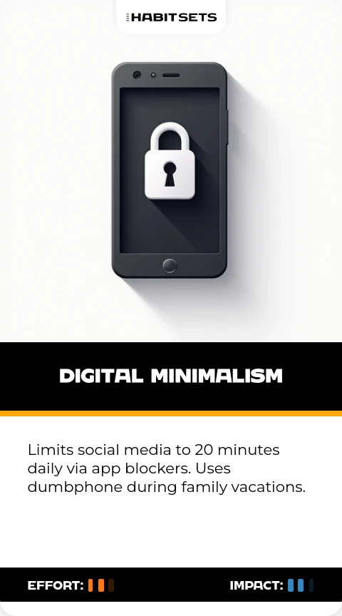 Limits social media to 20 minutes daily via app blockers. Uses dumbphone during family vacations.
