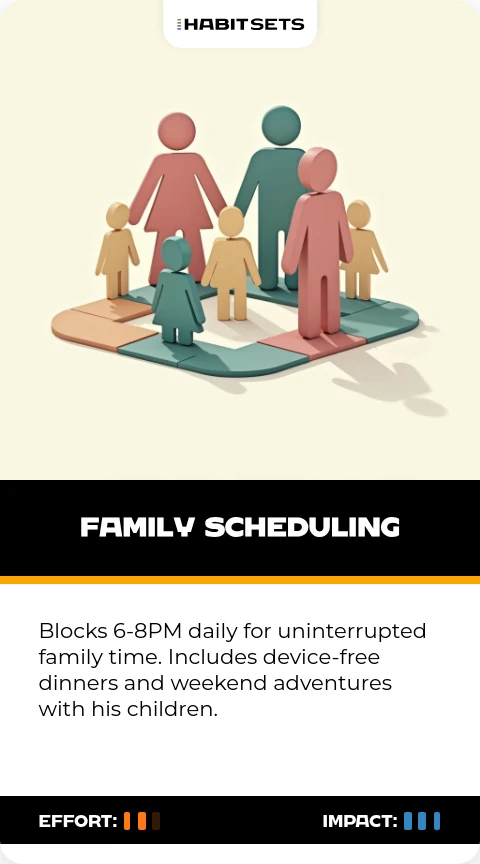 Blocks 6-8PM daily for uninterrupted family time. Includes device-free dinners and weekend adventures with his children.