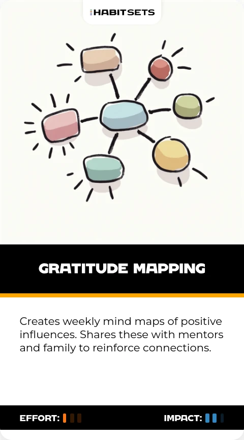 Creates weekly mind maps of positive influences. Shares these with mentors and family to reinforce connections.
