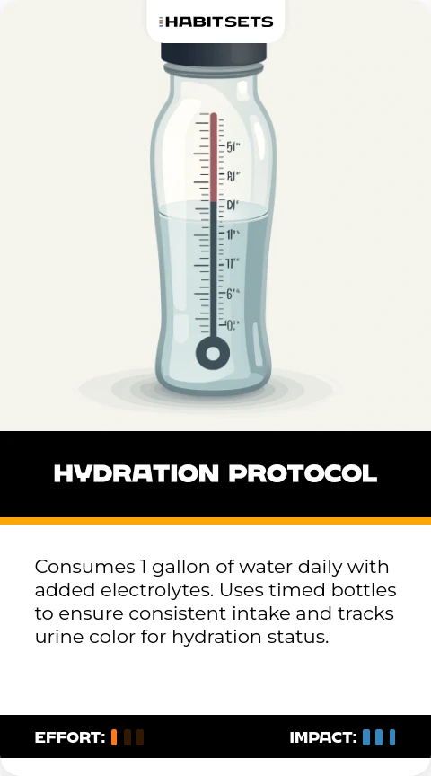Consumes 1 gallon of water daily with added electrolytes. Uses timed bottles to ensure consistent intake and tracks urine color for hydration status.