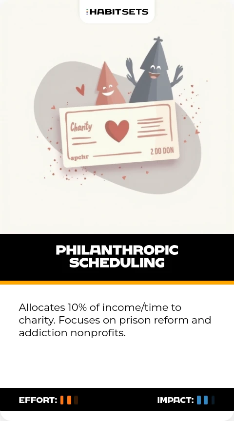 Allocates 10% of income/time to charity. Focuses on prison reform and addiction nonprofits.