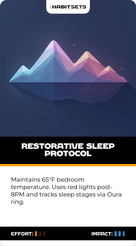 Maintains 65°F bedroom temperature. Uses red lights post-8PM and tracks sleep stages via Oura ring.