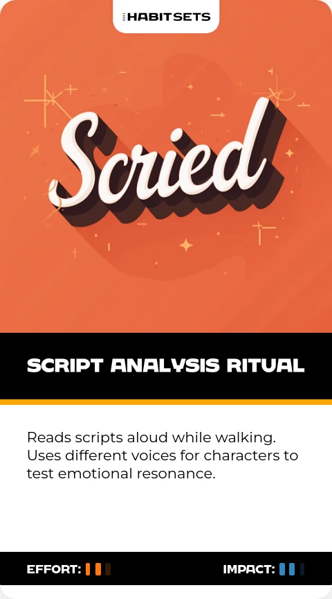 Reads scripts aloud while walking. Uses different voices for characters to test emotional resonance.