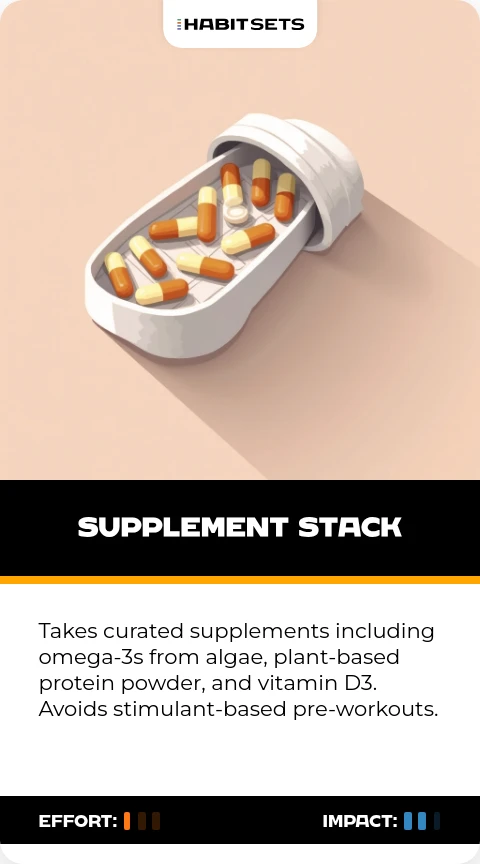 Takes curated supplements including omega-3s from algae, plant-based protein powder, and vitamin D3. Avoids stimulant-based pre-workouts.