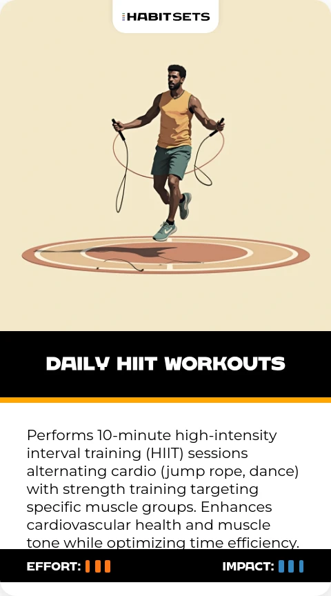 Performs 10-minute high-intensity interval training (HIIT) sessions alternating cardio (jump rope, dance) with strength training targeting specific muscle groups. Enhances cardiovascular health and muscle tone while optimizing time efficiency.