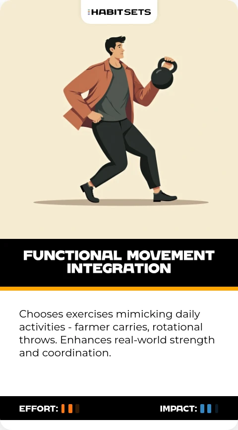 Chooses exercises mimicking daily activities - farmer carries, rotational throws. Enhances real-world strength and coordination.