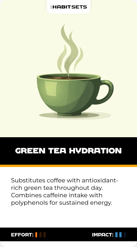Substitutes coffee with antioxidant-rich green tea throughout day. Combines caffeine intake with polyphenols for sustained energy.