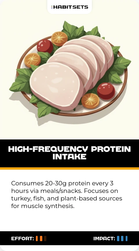 Consumes 20-30g protein every 3 hours via meals/snacks. Focuses on turkey, fish, and plant-based sources for muscle synthesis.