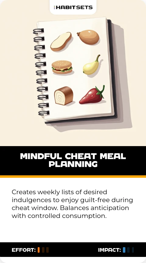 Creates weekly lists of desired indulgences to enjoy guilt-free during cheat window. Balances anticipation with controlled consumption.